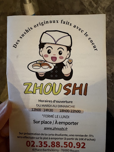 Read moreÉtant sur Rouen pour un weekend nous avons testé les sushis de chez Zhoushi. Je n’ai pour l’instant pas trouvé meilleur qualité prix qu’ici en ayant pourtant visité beaucoup de grandes villes françaises. Il y a beaucoup de choix sur les sushis, makis et autres spécialités japonisantes, les classiques et des originaux, le service est agréable et rapide, la commande s’effectue sur un iPad à l’entrée. Évidement la quantité de poisson n’est pas stratosphérique mais tout à fait convenable pour le prix et les sushis sont faits à la demande. Nous avons beaucoup apprécié. Dommage qu’il n’y ait pas d’enseigne ailleurs j’irai avec...