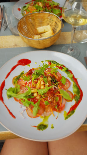 Mon mari, mes 2 grands ados et moi-même y avons déjeuné ce midi... Un accueil des plus chaleureux malgré la pluie battante à l'extérieur. Seule au service, Madame, très pro, assure du début à la fin (jusqu'à l'encaissement où nous avons eu plaisir à discuter de nos vacances dans le coin et pu profiter de ses conseils sur les lieux a voir et visiter), avec le sourire et toujours un mot bienveillant à l'égard du client. Une carte alléchante, accessible et efficace. Mes ados se sont régalés avec le burger de boeuf, une assiette équilibrée et généreuse. Mon mari a pris la suggestion du jour : tourte vigneronne et crudités, suivie d'une saucisse blanche avec ses petits légumes (une tuerie, entrée comme plat!), et moi j'ai pu découvrir un plat que je ne connaissais pas, le Vitello tomato, et j'ai adoré ! Les desserts ? Certes les prix sont élevés, mais on oublie vite tant ils sont originaux et aboutis ! Nous recommandons chaleureusement cet...