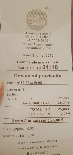 Read moreJe suis une cliente fidèle de eat sushi à emporter mais quelle déception de manger là bas à midi ! 2 jeunes filles qui ne disent même pas bonjour quand on rentre mais plutôt "vous avez commandé ?" On a l impression que c est payant pour elles de parler . Surtout celle qui porte des lunettes ! Aucun "bon appétit ""ça à été ?" Comme on peut normalement entendre dans tous les restaurants ! Est ce un problème de formation ou de recrutement estival ?? Franchement c est à revoir car elles ne donnent vraiment pas envie de revenir ! Aucun professionnalisme de la restauration. Même dans les fast food ils sont plus aimables. Seulement 2 tables occupées donc elles étaient loin d être débordées ! Déception alors que je laisse au moins 80€ à...