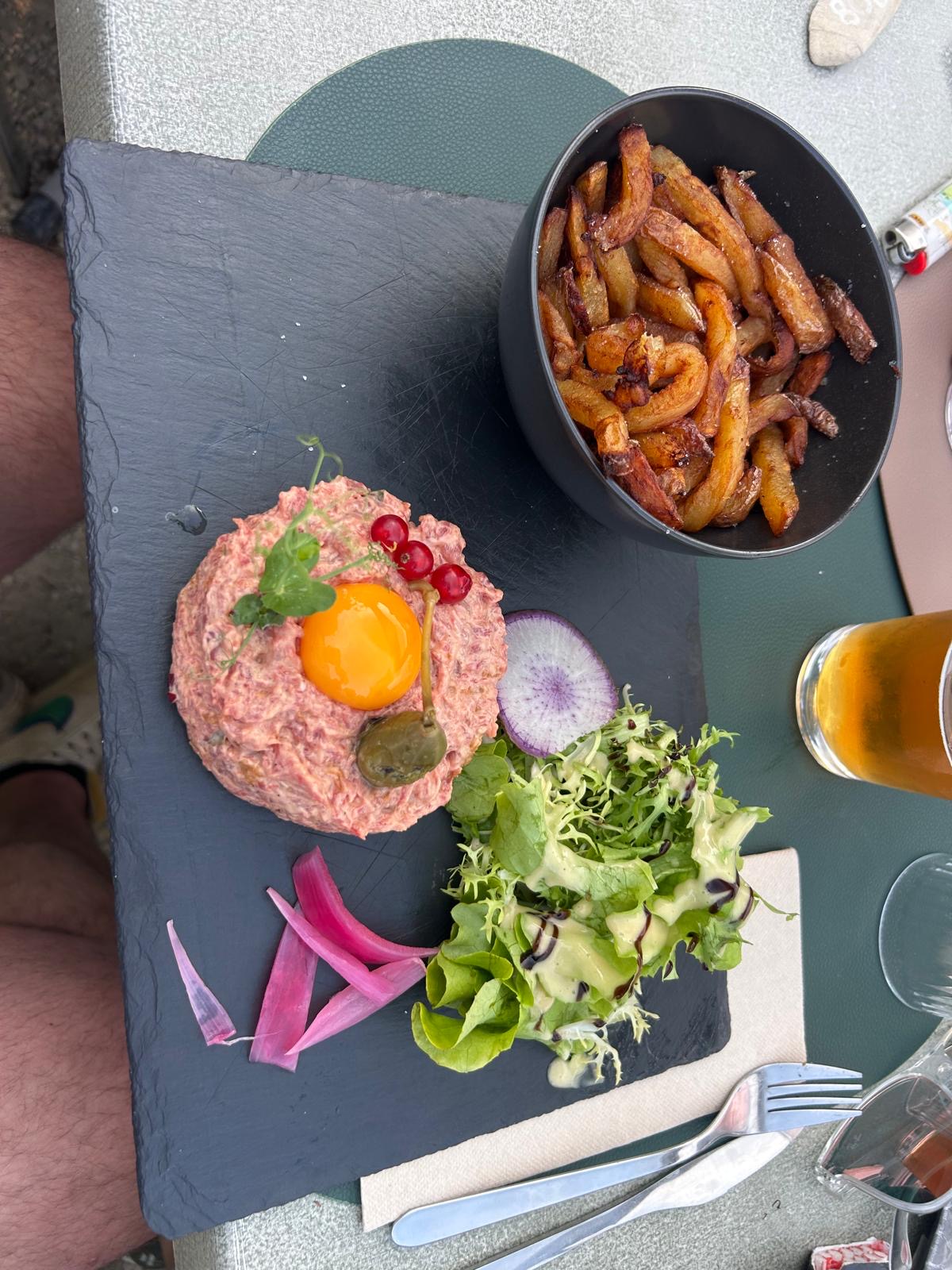 Read moreHistoric burger! Perhaps the best burger the blonde has ever had - Charolais beef. Frites not crispy. Great service from a waiter who had worked in Gin Gin Western Australia! The restaurant looks fabulous outside, but a bit ordinary inside. However there is cheffy stuff going on. Good wine by the...