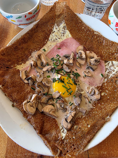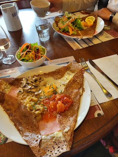 Read moreBon, sans plus. Le service est rapide, la serveuse est polie. Les plats sont très simples, sans distinction, c’est le genre de restaurant où on y mange seulement pour être dehors et/ou ne pas cuisiner, pas pour la spécialité des plats. La crêpe végétarienne (au moins elle existe) a un bon fromage et de bonnes tomates, mais est pleine de jus et peut finir par être écoeurante. Les portions sont correctes, elles ne rassasient pas mais remplissent suffisamment un appétit moyen. La salade manque d’assaisonnement et d’intérêt. Le cidre est doux, bon d’après les connaisseurs. La crêpe Belle-Hélène ne m’a pas beaucoup plus mais pourrais plaire à d’autres. Je m’attendais surtout à de la poire cuite mais à la place il y avait une poire dure et froide. J’ai goûté le caramel...