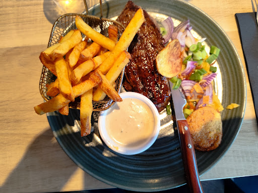 Un restaurant/brasserie que je ne connaissais seulement que de nom, et j'ai été bluffé des l'entrée, le restaurant est très propre et la décoration très jolie, moi et ma copine avons été reçu et accueilli de manière exemplaire. Pour ce qui est du service, nous avons été servi au cours du repas pas une serveuse et deux serveurs, tout les trois très courtois, souriant, rapide et soucieux du bien être des clients, chose dont je n'ai pas été témoin souvent. Pour le repas, nous avons décidé de prendre une assiette fromage charcuterie à partager pour l'entrée il y avais une bonne présentation dans l'assiette et l'entrée délicieuse. Pour le plat de résistance j'ai opté pour une entrecôte de 500g accompagner d'une sauce au poivre dans un petit recipient et de frites maisonqui étaient delicieuses. L'entrecôte était cuite de manière parfaite selon ma demande et que dire du goût, entre la cuisson parfaite et la qualité de la viande qui doit être très bien suivi, c'est une des meilleures entrecôtes que j'ai manger dans un restaurant au prix très abordable (entrée , repas, et petit apéritif pour deux =59 euros) . Je retournerais sans hésiter dans ce restaurant où j'ai passer une bonne soirée et manger...