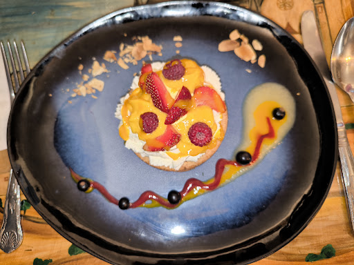 Read moreUne excellente expĂ©rience de vacances. Le cadre au thĂšme mĂ©diĂ©vale est sympathique, tout comme les gens qui y travaille qui sont chaleureux et humains. On voit que lâendroit est apprĂ©ciĂ©. Jâai beaucoup aimĂ© que lâesprit mĂ©diĂ©val reste dans les plats et les boissons, mais quâil y ait quand mĂȘme un menu vĂ©gĂ©tarien. La soupe de lĂ©gumes en entrĂ©e Ă©tait agrĂ©able et pas lourde du tout, le pain Ă lâail qui lâaccompagnait simple mais terriblement efficace (le pain qui est servi en corbeille est trĂšs bon aussi). Le plat (annoncĂ©e comme une sorte de tarte aux lĂ©gumes) nâavait lâair de ce Ă quoi je mâattendais : il sâagissait dâune tranche de tarte/quiche de lĂ©gumes mi-cuits avec beaucoup dâappareil, qui Ă©tait douce et laissait le goĂ»t des lĂ©gumes ressortir, dâun assortiment de lĂ©gumes cuits avec de lâhuile et de petites pommes de terre. Ă cĂŽtĂ©, il y avait une sauce au fromage de chĂšvre et trĂšs goĂ»teuse bien salĂ©e qui contrebalançait la lĂ©gĂšretĂ© du reste, et moi qui nâaime pas le fromage de chĂšvre, cette sauce a su rapidement me sĂ©duire. Une femme (gĂ©rante ?) qui servait et cuisinait nous a parlĂ© de comment elle prĂ©parait les repas : elle utilise des lĂ©gumes de saison et des produits locaux, de commerçants de quartiers. Les plats devant ĂȘtre prĂ©parĂ©s Ă lâavance sont faits le matin pour le midi et lâaprĂšs-midi pour le soir. En somme, la qualitĂ© ne sâarrĂȘte pas au goĂ»t. Pour finir, jâai pris la dacquoise Ă la pistache avec quelques doutes car je craignais une gĂąteaux meringuĂ© plein de mousses mais heureuse surprise, une fois de plus le dessert Ă©tait dĂ©licat et lĂ©ger, avec du coulis de framboise et de passion, le rectangle de dacquoise Ă©tait non seulement couvert de fruits, mais tous diffĂ©rents ce qui ne rendait pas le gĂąteaux monotone. Conclusion : une...