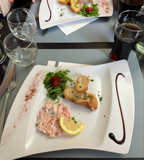 Read moreHonnêtement vu la note moyenne on pouvait s'attendre a un restaurant fabuleux et en fait non. donc on est venu un midi en semaine en prenant le menu du midi à 18€ (entrée plat dessert), tarif tout a fait correct. On commande notre apéro et nos plats, l'apéro arrive (2 kirs) pas frais, de même que la carafe d'eau pas fraiche non plus (on est donc au mois d'Août), l'entrée suit quasiment aussitôt malgré notre apéro juste entamé. On s'attend donc à un tarif rapide vu l'empressement pour nous servir l'entrée, nous avons attendu environ 30 min pour avoir notre plat de résistance, composé d'une bavette ridiculeusement petite et trop cuite, bon point pour les frites par contre. Pour le poisson pareil portion un peu petite. Dessert correct Petit mot pour la serveuse alors qu'il y a pas mal de clients, elle passe plus de temps à jouer avec ses cheveux derrière le comptoir qu'aider...
