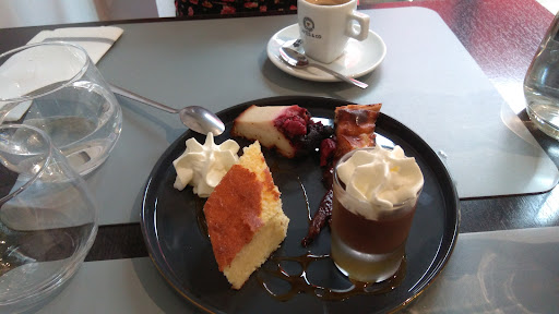Quand on voit tous les avis donnant 5 étoiles on se dit qu'on ne peut pas être déçu, et pourtant ! En début de repas on nous apporte une carafe d'eau, sans même avoir besoin de demander, ce qui est appréciable, mais cela l'est moins lorsqu'on s'aperçoit qu'elle n'est pas fraîche. Mais le plus ennuyant c'est que le Ice tea et la bière n'était pas frais non plus. Les frites surgelées accompagnant la viande étaient trop salées et, si je peux comprendre que tout le monde ne souhaite pas boire d'eau trop fraîche, j'ai du mal à comprendre qu'on ne me laisse pas assaisonner mes frites à mon goût. 9,9€ pour un café gourmand, j'ai trouvé ça très élevé mais je me suis dit qu'il devait être exceptionnel... eh bien ! non... mais alors pas du tout. Les mignardises ne présentaient pas bien du tout, et, du point vu culinaire, ce n'était pas mieux du tout. Une mignardise était brûlée, la part de cake était dense et sèche et même la mousse au chocolat n'était...