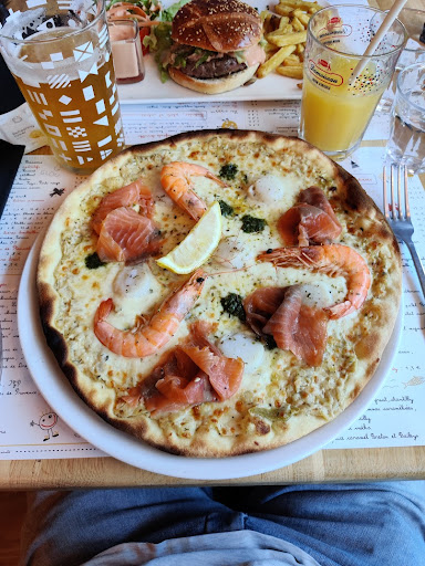 Restaurant que je recommande car c'est vraiment mon gros coup de cĆur . Le restaurant est Ă cĂŽtĂ© de la plage du casino de Saint Quay Portrieux et derriĂšre le restaurant " La p'tite crĂȘperie " . Parking gratuit tout autour du restaurant par contre cela peut ĂȘtre difficile de se garer les jours de fortes affluence notamment pendant les vacances . Le restaurant possĂšde une grande salle ainsi qu'une belle terrasse ( pratique pour les fumeurs ) . Le personnel est trĂšs avenant et trĂšs pro sans en faire trop . La carte de base est axĂ©e sur les pizzas mais ils font aussi d'autres plats comme des burgers , entrecĂŽte , poĂȘlĂ©e de saint jacques et moules frites ( uniquement en juillet et aoĂ»t ) . Le restaurant propose aussi un menu du midi avec entrĂ©e plat ou plat dessert pour 19 ⏠50 ou l'entrĂ©e , plat , dessert pour 22 ⏠50 . Les plats comme les desserts sont vraiment trĂšs bien prĂ©sentĂ©s et dans de la belle vaisselle . Je rajouterai aussi que les plats sont faits avec des produits frais et de qualitĂ© et qu'ils ont un super bon cuisinier tant la cuisson des aliments sont d'une rare qualitĂ© ( de mĂȘme que la cuisson des viandes est respectĂ©e ) . Pour ma part j'ai pris la pizza " Garcia " Ă base de poivrons , oignons , merguez et chorizo et c'Ă©tait une vĂ©ritable tuerie tant visuellement que gustativement et en plus gĂ©nĂ©reuse dans le sens ou les merguez sont des beaux morceaux ; le chorizo de belles tranches et non pas des lamelles ; et que dire des oignons et des poivrons : on aurait dit qu'ils Ă©taient confis . Ma femme a pris le menu du midi ( entrĂ©e , plat ) et c'est servi et prĂ©sentĂ©s comme Ă la carte et pour le dessert elle a craquĂ© pour le " cafĂ© Miam-miam " ; c'est un cafĂ© gourmand que je recommande car la encore c'est une tuerie . Enfin les desserts sont du mĂȘme acabit que les plats soit gĂ©nĂ©reux , bien prĂ©sentĂ©s et tout aussi gourmands et goĂ»teux . Pour 5 , j'ai payĂ© 149 ⏠pour plats , une bouteille de cidre , desserts et cafĂ©s ce qui pour ce qui est servi et pour cette qualitĂ© est pour moi trĂšs abordable puisque pris Ă la carte . A noter aussi que ce restaurant prend les chĂšques vacances . VoilĂ pourquoi au travers de ce que je viens de dĂ©crire , ce restaurant est mon gros...