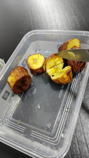 Points à améliorer : (d'où le retrait de 2 étoiles) : Personnel silencieux et peu souriant, bien que courtois. Morceaux de cartilage ou de carcasse dans le riz au poulet, c'est peu ragoûtant. grosse déception sur la banane plantain : pas bien cuite à l'intérieur et aucun goût (ce bon goût de friture, totalement absent). Si elle avait juste été colorée à l'extérieur au pulvérisateur marron, cela aurait eu le même goût. Très déçu. En plus elles sont toutes collées et ne cuisent donc pas à l'intérieur. (voir images) Si on ne veut pas de boisson dans un menu, on doit la...