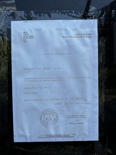 It further reads, “Le préfet de la Seine-Saint-Denis a décidé la fermeture administrative de l'établissement « MARINA NEUF TROIS »”