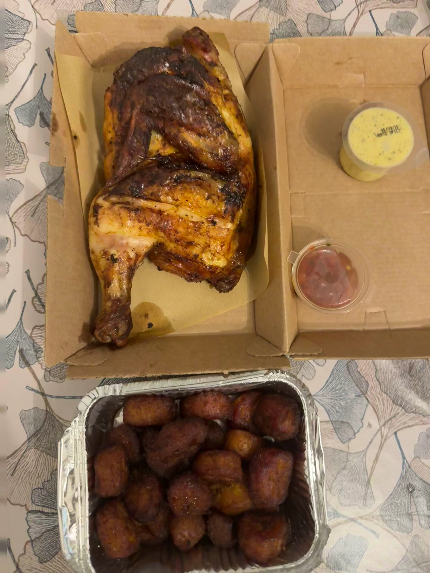 Very generous portion size. I’ve ordered takeout on two occasions from here. Often you’ll find rotisserie chicken to be dry, theirs is very juicy with crispy skin. My first time ordering I got lucky and received an extra 1/2 chicken (fried). The seasoning is standard, the sauces really elevate the flavor. The spicy green sauce is top notch and the red spicy sauce/ chili oil is truly spicy 🌶️ which I loved. Very generous side of plantains which were pretty good, had a nice char and flavor. The only reason why I’m giving 4 stars is because my salad was a bit too overdressed...