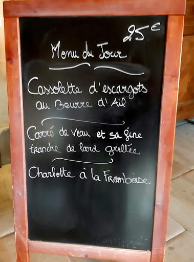 Le menu du jour : Il y a un menu du jour annoncé sur une grande ardoise sur pieds à l'entrée du restaurant. Lorsque j'y suis passé en octobre 2022 le menu est à 25 € hors café et boisson. En entrée, le chef propose la cassolette d'escargots au beurre d'ail, puis en plat, le carré de veau et sa fine tranche de lard grillé, et en dessert la charlotte à la framboise. C'était plutôt excellent.