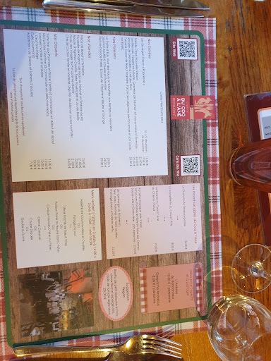 Les plats à la carte : Voici quelques exemples de plats et les prix qu'on peut voir sur la carte : La choucroute strasbourgeoise 21 € -La mustiflette du coq à l'âne 13 € -La raclette classique 20 € -Le hamburger du bûcheron avec pommes de terre sautées, fromage blanc et salade verte 19 €. -La truite 20 €. -La brochette de scampis poêlée 22 €. -Le double filets de limande 22 €. -La pièce de bœuf à l'échalote confite 23 €. -La fricassée de rognons de veau 18 €. -Le pot-au-feu de paleron de bœuf en gros sel 20 €. -Le vacherin vanille framboise 9 €. -La tarte aux pommes et glace vanille 10 €. -Le café gourmand 9 €. -La crème brûlée au bonbondesVosges 9€. etc...