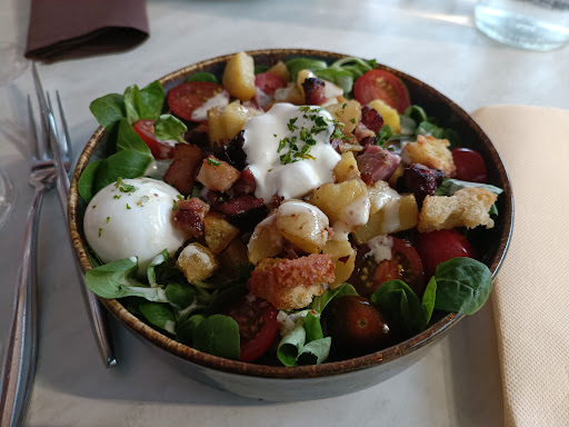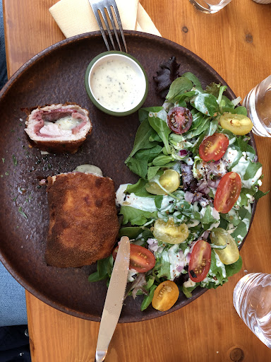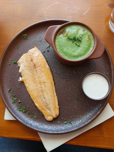 A chaque plat, j'ai eu de très belles suprises. A l'apéro en découvrant les jus pressés a froid localement de fruits régionaux (minimum de sucre ajouté quand possible), le fuseau lorrain et le saucisson à l'ail des ours de leur bouchee. La salade Vosgiennes quelle merveilleuse d'élégance et de goût! On ne pourra plus m'en présenter une sans que je la compare à la vôtre. Avec une petite touche de crème de la crémière locale qui ravit mon palais. La truute saumonnée avec un flan au petit pois délicieux. Et enfin le café gourmant avec la glace de leur laitière: fleur de lait marbré de myrtilles un régal. La prochaine fois je veux absolument prendre la tarte du moment (aux myrtilles maison!). Ce fût un moment très agréable! Je me suis régalée du début à la fin.