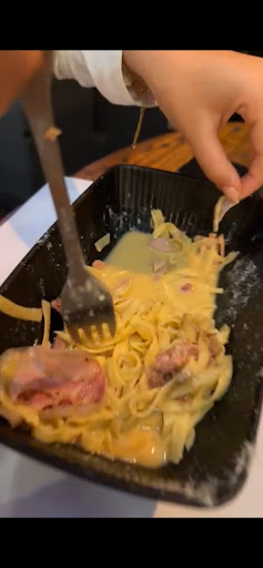 Côté plats : • La pizza était très bonne, rien à redire. • Les tagliatelles à la carbonara étaient correctes, mais les morceaux de pancetta étaient trop gros : des morceaux plus fins auraient été plus agréables à manger.