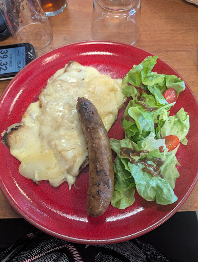 On a aimé : la vaisselle colorée ( pichet, beurrier pour l'assiette de fromages) l'accueil sympathique et le service avec le sourire malgré l'affluence en ce 8 mai la saucisse servie avec la truffade, verdict : très bonne l'assiette de fromages l'ambiance simple et décontractée comme on aime