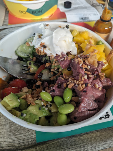 Read more⭐ Délicieuse expérience ! Je cherchais un restaurant qui accepterait de réchauffer le biberon de ma fille — après m’être fait recaler par deux établissements (que je ne citerai pas 😉), je suis finalement tombée sur Bohébon. Une jeune femme brune, très gentille, a tout de suite accepté de me le réchauffer. J’ai donc décidé de rester déjeuner sur place, et c’était une première pour moi : je ne connaissais pas du tout les pokés.