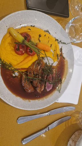 Pour les entrées, un foie gras honnête présenté très simplement cela dit. En revanche, pour madame une seule petite langoustine plongée dans une bisque qui manque de cruellement de relief (la langoustines était au pluriel sur le menu...) Pour les plats, ils sont correctement exécutés globalement avec un bémol sur l'équilibre en agrume de l'écrasé de gnocchis. Côté présentation pas de remarques particulières, ça fait le job. Passons au dessert : Joliment présenté pour le coup mais assez lourd et qui a un goût assez proche d'un "Pim's à la framboise" pour ceux qui connaissent. Pour les boissons, une Evian et un Graves "Les croix blanches" 2021 très oubliable...