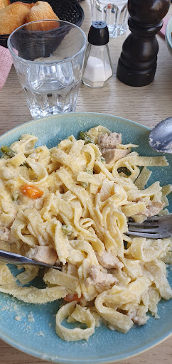 Concernant la cuisine, les entrées passent trÚs bien, mais les pùtes au poulet sont arrivées avec littéralement (encore une fois) 4 bouchées de poulet.. à 19⏠l'assiette, ça fait mal, surtout aprÚs 2 heures que nous étions à table. Pour les desserts, nous avons préféré les prendre ailleurs pour ne pas perdre l'aprÚs-midi complÚte, la moitié suffit.