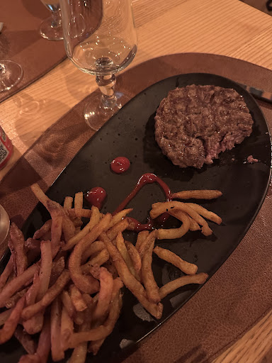 En ce qui concerne le dĂźner, plus que mitigĂ©. Planche de charcuterie Ă un peu plus de 10euros pour quelques morceaux de charcuterie qui se battaient en duel (les morceaux de chorizo Ă©taient mĂȘme collĂ©s entre eux (genre barquette de charcuterie quoi))... Passons, le burger Ă©tait plutĂŽt bon, mĂȘme si petite portion. Plateau de fromage et CafĂ© gourmand trĂšs trĂšs lĂ©gers, pour une addition qui, elle ne l'est pas au regard de la quantitĂ©.