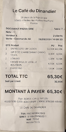 Read moreDurante nossa passagem pela encantadora cidade de Villedieu-les-Poêles-Rouffigny, decidimos fazer uma pausa para o almoço. Após caminhar um pouco pelas charmosas ruas da cidade e explorar algumas opções, encontramos o restaurante Le Café du Dinandier. Optamos por experimentar o entrecôte, que estava delicioso e preparado no ponto perfeito, superando nossas expectativas.