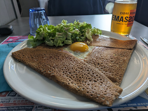 Très bon accueil et serveuse très sympathique. Nous aimons aller manger dans un petit restaurant convivial. Les galettes sont bonnes et copieuses pour certaines. C’est toujours un plaisir d’en découvrir de nouvelles à chaque fois. Les desserts que ce soit crêpes ou coupe glacée sont tout aussi savoureuses. Si vous avez envie de manger des galettes accompagnées de boissons régionales (jus de pomme et cidre) nous vous conseillons cette crêperie. Pensez à réserver si vous êtes nombreux ou pour être certain...