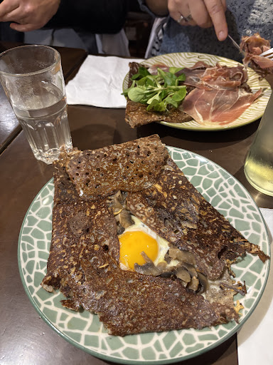 This restaurant is amazing! First of all, it is in a great location, within the old city walls. However, the food is even better than the location. We had a few different ciders, galettes, and crepes. Our waiter was very friendly and happy to answer our questions about the food (we all spoke French, but were not familiar with all the local foods). They allowed me to 'construct' my own dessert (I can eat galettes, but not crepes, so this was great for me). They also have a wide variety of flavors and foods that I haven't seen anywhere else. For example, they have ginger ice cream, which is delicious but very, very hard to find. This is definitely the best creperie I have found in France. (Note: their galettes are made purely of buckwheat ("sarrasin"/ "ble noir") so they are...
