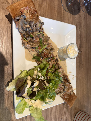 Read moreA éviter On avait appelé pour réserver à 21h00. On arrive à 20h59 : notre table n'est pas prête alors que la salle est à 1/4 de sa capacité. Il nous est demandé d'attendre 10 minutes. Serveuse à peine aimable. C'est propre, c'est neuf, par contre la musique est trop forte obligeant les convives à parler fort donc c'est bruyant. 1 seule carte pour un table de 6 ! A chaque fois que la porte des cuisines s'ouvre, on y constate des personnes (personnels, livreurs, ... ?) qui ne portent pas le masque ! Les galettes sont décevantes par rapport au prix. faiblement garnies, les coins sont archi secs, Pour la complète forestière, où sur l'ardoise les lardons sont annoncés comme premier ingrédient, vous avez 3 malheureux lardons perdus parmi les champignons (probablement sortis d'une boite de conserve). Pour la complète andouille, il y avait tellement peut de fromage que je ne le sentais pas au goût. Nous étions 6, personnes n'a apprécié sa galette. Quant aux salades annoncées avec une vinaigrette, huile d'olive, balsamique, curry, graines de sésame torréfiées, on a vainement cherché les 3 derniers. Et au final on a été surfacturé de 4 € (117,5 € pour 2 cola, 1 sirop à l'eau, 1 bière, 2 kirs bretons, 5 complètes, 1 spéciale, 3 salades, 1 litre de cidre pression). Et sur les étagères du bar, on y constate des produits de marque de distributeurs de grandes surfaces (sirop de fraise Intermarché, sirop de menthe Super U) ce qui nous laisse à penser que les ingrédients sont de qualité de grande...