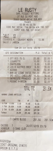 Alors le Rusty c'est avant tout une affaire de famille... Comment concilier restauration et escroquerie en bande organisée ?! Et bien allez faire un tour au Rusty et vous allez comprendre très vite. En arrivant ce soir-là, un serveur nous fait d'entrée l'article (comme lors de notre première venue) sur les viandes maturées (à éviter d'ailleurs), le vivier, ainsi que la pêche du jour, ce soir-là du bar de ligne...le serveur insiste d'ailleurs sur la qualité et la fraicheur de son poisson. Au moment de la commande mes parents demandent s'il est possible d'avoir un bar pour deux ? Comme quoi l'article fait dès votre arrivée fonctionne parfaitement... «Sans problème» nous répond le serveur, nous précisons bien pour deux personnes, car les poissons présentés avaient l'air conséquents... Après avoir consommé l'entrée, le bar arrive déjà cuit et il est énorme ! Avant que le serveur ne le lève en filet nous faisons part de notre surprise et lui faisons remarquer que c'est plus un poisson pour quatre que pour deux... Réponse du serveur : " Quand y’en a pour quatre y’en a pour deux "!?! Oui d'accord mais là c'est beaucoup trop, et c'est dommage de gâcher une aussi belle pièce... et surtout nous avions précisé pour deux... Bref, impossible de renvoyer le poisson qui aurait dû être présenté avant cuisson comme c'est l'usage dans un vrai restaurant ! On sent donc la belle arnaque se glisser derrière nos couverts... À la fin du repas il restait donc dans les deux assiettes de mes parents la moitié du poisson qui était au passage trop cuit. Nous demandons donc à parler à un responsable qui arrive assez rapidement et nous fait savoir qu'il n'a en fait aucun pouvoir de décision ! Nous lui faisons remarquer preuves à l'appui que le plat ne correspondait pas à la commande, et que ce genre de méthode pousse à la consommation... Le serveur (qui est le fils du patron) fait l'étonné et ne voit pas du tout ou est le problème. Et bien le problème en fait c'est comme quand je vais chez le boucher et que je commande 500G de steak haché et qu'il m'en sert 800G en me disant ça ira ?! Bon bah du coup nous nous dirigeons vers la caisse pour aller payer et essayer d’aller glisser un petit mot au responsable, et là nous tombons entre les mains de la fille du patron, nous lui faisons la même remarque en lui précisant que la pièce était démesurée et ne nous avait pas été présenté avant cuisson... Et là attention on tombe dans le grandiose ! "Chez nous tous les bars de ligne sont calibrés pareils...(!?) qu'ils fassent 1,5 KG où 2 KG c'est le même prix...(!?), il fallait mieux regarder avant..." Bref face à tant de mauvaise foi je demande la note... et là ... bim 150€ le bar pour deux ça fait chéro le moronidé ! De plus les prix de la pêche du jour ne sont affichés nulle part et ça c'est plutôt illégal. Pour faire passer la note que nous réglons la fille du taulier nous présentent trois misérables shooters que nous déclinons et je demande à parler au responsable de l'établissement. Tout le monde esquive ma requête, je me retourne et le boss était là en train d'assister à la scène, mais faisant mine de faire autre chose… Je m'avance vers lui pour lui faire part de ma déception, il refuse de me parler, je lui dis donc que nous nous retrouverons sur internet...et là changement de ton, il s'énerve, nous demande de partir...et finit par m'insulter ! Nous quittons donc ces escrocs de la cuistance et leur restaurant rouillé, le patron ferme la marche nous raccompagne dehors et me suit jusqu'à ma voiture pour prendre ma plaque d'immatriculation en photo… Vous avez dit surréaliste ? Ce sont des méthodes que l'on utilise pour les mauvais payeurs et je pense que nous ne faisions pas partie de cette catégorie avec une note à 291,50€ pour 4 ! Bref le Rusty c'est tout en vitrine et rien en magasin, nous étions en famille pour passer une bonne soirée et c'est l'inverse qui s'est produit, l’amère sensation de s’être fait arnaquer. Mais c’était les vacances… donc pas...