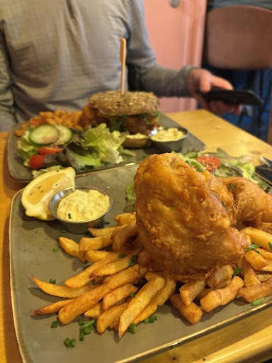 Petit bar / restaurant qui propose des plats, burgers et bowls à la carte et disposant d'une petite terrasse devant . Il y a des options veggie, pour lesquelles nous avons opté en voyant la proposition du burger : Halloumi, coulis de poivrons , avocat ... La recette nous a donné envie (ça change d'une simple galette de pomme de terre !) et nous n'avons pas été déçues . Nous avons choisi de prendre à emporter pour les déguster un peu plus bas, devant la mer : notez que les plats sont moins chers, si vous les emportez . Notez aussi que ça sent bon, ça donne envie, et ...aux mouettes et goélands aussi .... (C'est une petite prévention car ils viennent directement , et eux aussi veulent goûter !!) Les burgers étaient généreux , bien garnis et pas du tout secs ; halloumi très bon, le coulis de poivrons se marie très bien avec l'avocat !! Vraiment très bon on s'en lèche les doigts ; d'ailleurs, ça dégouline un peu ; les serviettes n'étaient pas de trop 🤭 Avec les frites , ça nous a bien calées : et le top, mayo maison, très bon goût, avec le soin de pocher à la douille. En ce qui concerne l'endroit , l'ambiance avait l'air plutôt conviviale pour s'y poser ! On peut se garer un peu plus loin, il y a des places gratuites dans le quartier ; elles sont assez prisées... Pour celles et ceux qui désirent manger " plus sain" il y a plusieurs choix de bowls avec comme base boulgour, chou rouge concombre, tomates cerises etc...