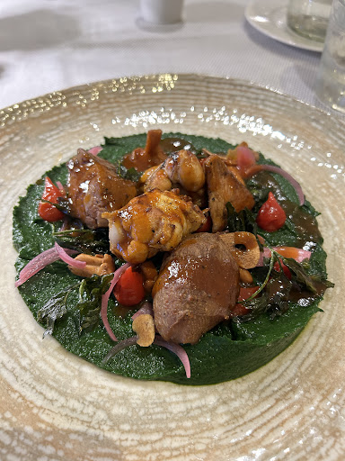 Dernière info, le menu était à 78 euros sans poulpe. Nous avons réglé notre menu en sa totalité . Sur l'autre menu nous avions choisi un velouté de lièvre à la royale, celui-ci a été servi froid. Vu la qualité du service, nous nous sommes demandés si c'était normal que le velouté soit froid.... D'ailleurs ça ne ressemblait pas un velouté. Le lièvre , champignons, ravioles étaient tous froids, déposés en cercle avec une sauce froide, au milieu de l'assiette ??? Très très...