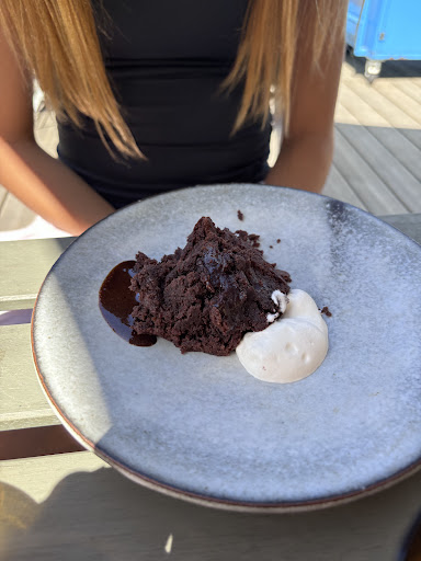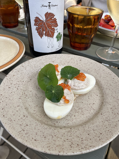 Patronne aimable et c'est un vrai plus. Belle terrasse, tables élégantes, ambiance sympa. Toutefois les prix sont beaucoup trop élevés. On a fait la remarque, et la patronne s'est justifiée en sortant l'argument "on achète chez des producteurs locaux et il y a l'inflation". On travaille dans le secteur depuis 18 ans, on connaît très bien les prix, et on sait que 12€ pour 3 tomates cerise (vraiment, il y en avait 3 dans l'assiette) servis avec un filet d'huile d'olive et trois bouts de fromage grands comme un ongle, c'est trop cher. Même si le restau s'approvisionne chez des producteurs locaux (démarche que nous apprécions et soutenons, évidemment). On ne venait pas pour avoir de la nourriture de fast food, car on connaît bien la différence entre un fast food et un restau qui a un bon rapport qualité-prix et qui rémunère ses producteurs à leur juste valeur. Mais essayez de revoir vos quantités, ou vos prix, car la balance n'est vraiment pas en équilibre. Sortis affamés avec une note de plus de 80€ pour 3 minuscules entrées, un plat (pas très copieux lui non plus), deux verres de vin et une boisson, on ne conseille pas ce...