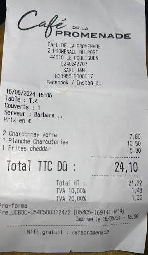 Read moreAlors de visite à ce café de la Promenade dans la ville de Pouliguen , j’ai adoré moi et mon mari avons adoré l’endroit la belle terrasse calme et bien situé en vue des bateaux, les planches apéros très bien servis les frites au cheddar très bien et généreuse portion , avec le verrez de vin chardonnay qui était frais magnifique, un grand merci pour cette belle jeune femme Barbara qui nous a servie avec un sourire 🙂 et surtout un accueil magnifique je reviendrais tout était magnifique un excellent moment je recommande et je...