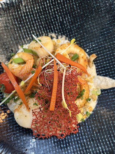 Read moreAccueil froid, le personnel semble être en conflit. L'arrivée de la carte s'est fait attendre. Aucun de leurs plats n'est confectionnés en cuisine ( Saucisson gras avec membrane plastique, acras de morues fade et industriel tout comme leurs tempuras aux crevettes ). Les plats alléchants et que l'on croit élaborés lorsque l"on regarde la carte le sont beaucoup moins une fois dans l'assiette. Ainsi, une fois l'assiette servie, le déception se fait sentir. Le fameux "filet de lieu noir au riz de Camargue et ses petits légumes avec son émulsion de chorizo" a l"air tentant dit comme cela sur la carte, mais une fois le plat arrivé, c'est juste un filet de lieu noir sec et une pseudo crème de chorizo bien huileuse avec quelques bouts de chorizo qui nous est servi. Et on se demande où sont passés les petits légumes? A moins peut-être que la salade mise sur le côté font office de "petits légumes"?! Quand à l'autre plat, "filet mignon de porc laqué au miel accompagné de son crumble de pain d'épice". Là aussi, alléchant, n'est-ce pas? mais non, là encore, nous sommes bernés par la carte, et là encore, ils se foutent du monde. Le filet mignon est censé être une viande tendre, et bien non chez eux, il est sec. Laqué? Laqué ne veut pas dire grillé? Puisqu'en effet, le filet mignon était grillé au grill et non laqué. Quand au miel, et bien, la saveur du miel je la cherche toujours. Ainsi, une viande qui est loin d'être tendre. Et que dire du crumble de pain d'épice, là, on atteint des sommets, nous berner comme ça, tromper le consommateur n'est pas normal?! Le crumble de ^pain d'épice, et bien, il n'y en avait pas, à moins que quelques toutes petites miettes de pain d'épice à peine perceptible sur le filet mignon soit du crumble de pain d'épice. Un crumble, ce n'est pas censé être un pseudo petit émietté à peine perceptible de pain d'épice! Ainsi, quand l'heure a sonné de payer, la note avait un goût très amère. En plus d'être déçu, il trompe consciemment le consommateur, ainsi si quelqu'un retrouve les petits légumes et le crumble de pain d'épice, faites-moi signe! Ah oui, et j'avais oublié, nous n'avons pas eu de carafe d'eau! Ce restaurant est à éviter, déception et...