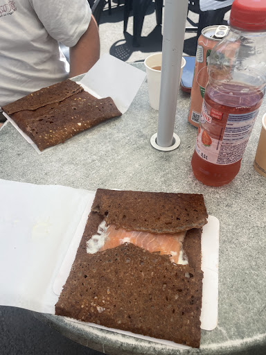 En entrée une crêpe beurre qui vous est tendue roulée ds une serviette papier.. (Pas d'assiette 😞)... Taille a peine 50 % de ce qui est habituellement servi. Avalée en deux bouchées. Insatisfait aussi côté saveur.