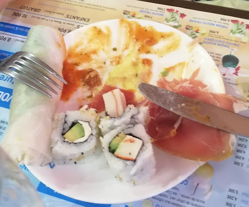 Mange bien, du choix pour tout les goĂ»ts (mĂȘme si vous nâaimez pas chinois ou japonais) possible de rĂ©server un table pour 10-20 personnes, la personne Ă la caisse est souriante et sympathique, choix en plat chaud ou froid, viande tendre, garniture variĂ©e, pour moi les plats sont chauds, le buffet est souvent rĂ©approvisionnĂ©, les gambas sont excellentes ^^, parlons du cadre qui est trĂšs agrĂ©able, neuf, siĂšges confortable, assez loin les uns des autres, le patron possĂšde 2 ou 3 du mĂȘme genre, cuisine ouvert et lâon voit que câest propre Ă tt heures. Les seuls bĂ©mols (si on veut chercher) le cuisinier pas trop bavard no souriant, dommage mais fait se quâon lui demande, et pour y avoir Ă©tĂ© souvent, la climatisation qui quelque fois va un peu trop fort et un frisson vous glace quelque peut. Question tarification ils sont tt Ă fait convenable, surtout que vous pouvez en reprendre Ă volontĂ© ! Assez de choix pour les cocktails et boissons alcoolisĂ©s. Je recommande...