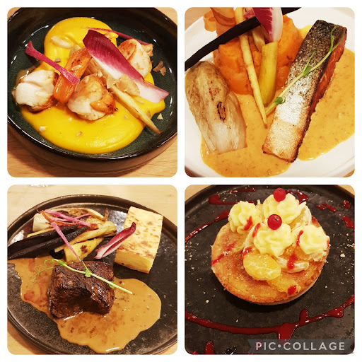 Le menu proposé était sensationnel: des saint-Jacques juste saisies à point, un saumon cuit sur peau pour moi et un steack pour monsieur; tous deux bien assaisonnés et les légumes croquants étaient parfaits, le dessert (une tarte aux clémentines maison était bien équilibrée et rafraîchissante).
