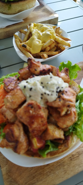 J’y ai pris un bowl au thon et un autre au poulet. Avec des frite de patate douce et un jus detox.