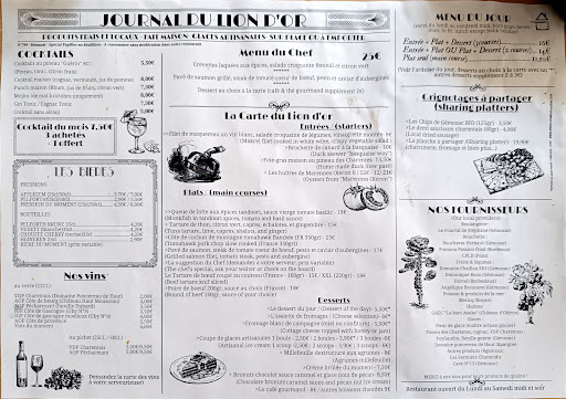 I'd driven by Le Lion d'Or many times and always imagined a sleepy little dive within so I was very surprised when I finally walked inside. It's modern with a lot of red and very clean. We went for lunch on a Monday in late September. I liked that they were seating people until at least 1:35 which is sometimes rare in small villages. The wait staff were very nice and spoke very good English and the food was what you would expect for a 13 E menu. I was impressed that they served eel as a main. The two other options were duck, which was tasty and steak. The steak came with a 3E surcharge. We both chose a warm chocolate cupcake for dessert which was nice. It was a lovely sunny day and thus a shame the patio was closed. We would recommend it when near Gemozac and in...