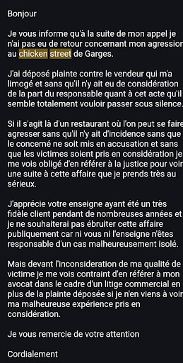 Read moreChicken Street à Garges-lès-Gonesse est une adresse incontournable pour les amateurs de street food halal. Situé avenue de Stalingrad, ce restaurant séduit dès l’entrée par son cadre moderne, propre et convivial. L’accueil y est chaleureux, avec un personnel toujours souriant et à l’écoute, ce qui rend l’expérience encore plus agréable.