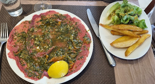 Read moreBon accueil. Cuisine traditionnelle et du quotidien. Le menu est présenté sur une ardoise. Pour le boeuf tartare cela requiert une meilleure présentation (pour en avoir dégusté ailleurs, l'oeuf, l'oignon, les sauces sont à dispo du client), les frites étaient correctes, le pain industriel, le dessert impeccable. Choix du menu soit vous avez la possibilité de prendre l' entrée/plat soit le plat/dessert. Pour ces options accompagnées d'une boisson et sans café, je trouve que le prix est un peu plus cher qu'ailleurs (rapport qualité/prix)....