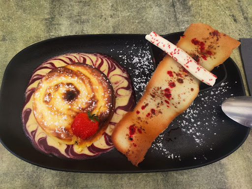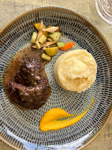 Read moreCalm and cozy. Fancy but no frills. They give you a nice little chef curated starter with the meal but you don't feel out of place in some dressy pants and a nice top of many varieties. I had the filet mignon (beef tenderloin) with truffle sauce, came with mashed potatoes and a smear of squash with a little pile of sauteed zucchini and red peppers. The steak was divine, perfectly cooked medium rare, 0.00% gristle. Tender, juicy, delicious. The truffle sauce was deep and rich and filled out the rest of the plate. I mopped up the plate with the French bread it was so good. Dessert was a praline and creme anglais with chocolate mousse type-beat. Also amazing, the main dinner plate was where it was at, though. Beer was cold and tall. You can't go wrong here....