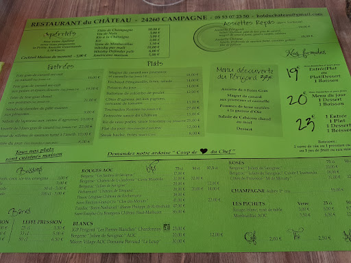 Les plats : Mon dieu... UN RÉGAL ! On peut observer dans l'assiette des produits locaux, de qualité et avec la quantité ! Un chef qui aime la bonne cuisine bien faite, dans la simplicité et authenticité, et avec la quantité. Laissez vous tentez par les plats dit '' du château '', faites confiance à cette équipe elle vous surprendra.