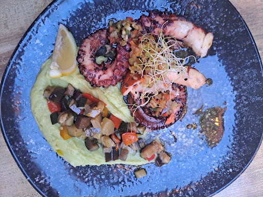 Wir hatten zur Vorspeise einen Salat mit warmen Ziegenkäse, karameliaierten Walnüssen und Pancetta, und zur Hauptspeise Pulpo mit Basilikumpüree und Zucchini-Auberginen-Gemüse. Beides war ausgesprochen gut zubereitet, lecker abgeschmeckt, frisch und der Pulpo der Beste, den wir seit langem gegessen haben, wenn nicht sogar der Beste!