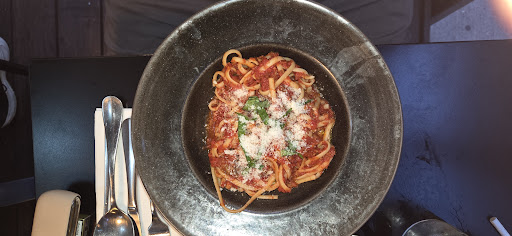 Nous voulions partir, mais nous ne voulions pas de scandale. Nous avons donc pris des pâtes. Bien sûr, celle-ci n'ont casy pas été manger !! Et service à 22h . A l'addition nous demandons un doggy bag . La serveuse nous répond, désolé nous n'avons aucune boîte ou support pour transporter !!! On ne fait pas ce genre de chose 😅 C'est une blague sincèrement !! Arrêter d'imposer des règles pour rien !! Les gens viennent au restaurant dans le but de se détendre, d'avoir un moment...
