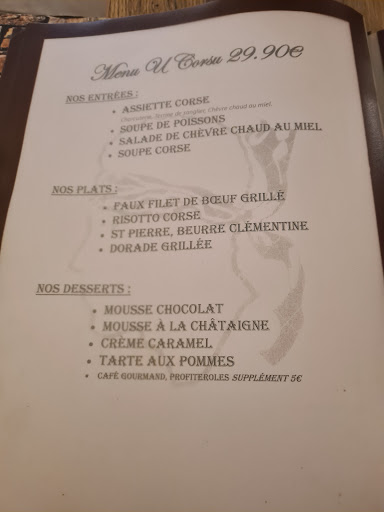 Read moreWe ended up eating here by accident having discovered that the restaurant in our hotel was not yet open for the summer. Unfortunately U Corsu was on the list of places suggested to us by the hotel receptionist. WE SHOULD HAVE READ THE REVIEWS FIRST! We were wanting to eat pizza, but having sat down and ordered apperitifs were told that pizza was not an option. We were then persuaded to have the fresh fish and were assured that 800gm would be sufficient for two. However when it (eventually) arrived it clearly wasnt. For some reason it was accompnaied by 4slices of fresh raw cucumber which gave one of the most unpleasant tastes i have ever experienced. The poor waitress was trying (unsuccessfully) to cope and consequently we waited 20 min for the bill as she tried to pacify another couple who were unhappy with the fish. Intrestingly the chef appeared and eventually confessed to the fish being only...