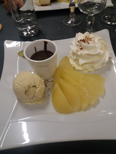 Read moreLe 31 octobre nous avons dîné pour la 1ere fois dans ce restaurant et avons choisi le menu à 35€ L'entrée foie gras était parfaite le plat filet de sandre sur lit de poireaux tagliatelles ( poisson trop cuit et nouilles très fines soi disant pour eux c'est des tagliatelles LOL ) le client à côté de nous avait pris comme dessert poire belle Hélène sur assiette avec 2 boules de glace qui nous a tenté donc nous avons choisi la même chose mais qd on nous a servi l'assiette nous étions très déçu de la présentation nous avions une demi poire 1 boule de glace et énormément de chantilly nous avons demandé pourquoi on nous sert la moitié du dessert même le client à côté était étonné la serveuse ne nous a pas répondu mais nous a envoyé la patronne qui nous a fait tout un discours pour nous faire comprendre que si on choisi le menu à 35€ le dessert est divisé par deux sinon c'est pas rentable et que tous les restaurants le faisaient mais jamais Nous avons vu et entendu cela ailleurs Vraiment déçu et surtout du bla bla bla de la patronne sans...