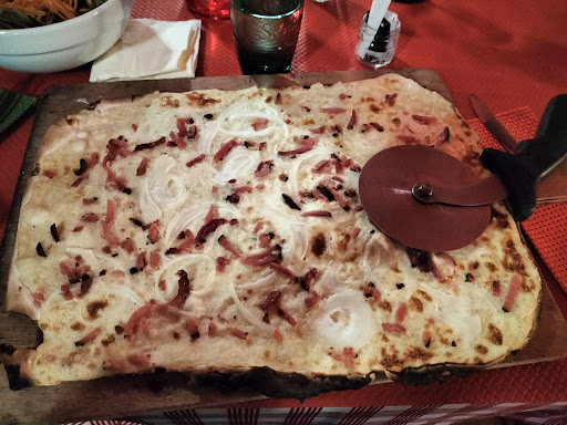Read morePour être franc, nous n'étions pas très à l' aise en arrivant tout juste à l ouverture du restaurant. Certainement un peu de retissance de notre part et de la dame car nous venions avec un bon. Je ne suis jamais vraiment à l' aise avec les bons. Nous avons pris une tarte flambée ail et ciboulette avec supplément lardons. Elle était bien garnie, une pâte à la fois croustillante et gourmande. Une magnifique tarte flambée qui sentait le vraiment le fait maison. Puis un jarret braisé pour moi, très copieux. Fondant et bien caramélisé comme j'aime. Ma femme, un cordon bleue. La panure était délicieuse et le reste aussi. L atmosphère s'est détendue. Nous avons passés un très bon moment. Tout le monde était très gentil mais surtout on s'est régalés. Nous reviendrons avec grand plaisir. Je ne sais pas si vous répondez aux critères, mais vous devriez faire partie de la confrérie de la véritable tarte flambée ! En tout cas...