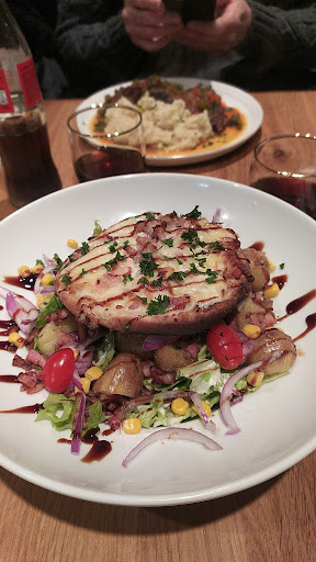 Cependant, nous avons remarqué que le choix de plats était quelque peu limité. En ce qui concerne la salade paysanne, nous avons été déçus. Elle se composait principalement de morceaux de pain et de pommes de terre, avec seulement des cubes de pommes de terre rissolées, mélangés à des cubes de pain, de la salade et des lardons. Nous aurions apprécié y trouver des tomates, des oignons et des œufs, même si cela aurait pu coûter un peu plus cher. Cela aurait certainement amélioré la salade, car le fait que les pommes de terre étaient sous forme de cubes congelés rendait le plat sec et peu savoureux. De plus, il y avait presque pas de vinaigrette.
