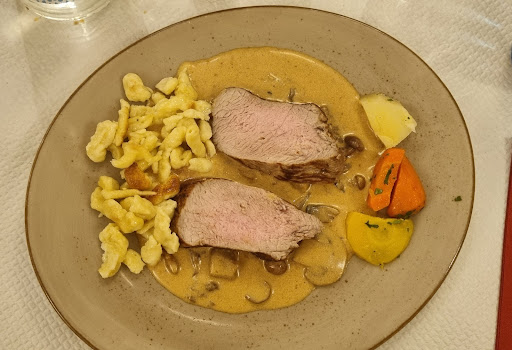 J'ai été conviée au repas d'entreprise qui a eu lieu au CG Selestat. Une découverte pour moi. Le cadre est chaleureux, un peu bruyant ce soir là, sobrement décoré. Nous avons eu : Entrée : foie gras et navette toastée (ce n'était ps le meilleur foie gras que j'ai jamais goûté mais globalement, j'étais satisfaite). Plat : quasi de veau sauce champignon, spaetzele, frites ou légumes. (La viande était légèrement sèche et manquait de sel) Dessert : trio gourmand : chouquette à la cerise, mousse au chocolat, glace aux épices de Noël (l'association de la crème, du chou et de la cerise n'a pas fait l'unanimité, la mousse au chocolat était un peu trop sucrée, et enfin, la glace était surprenante mais agréable). Je suis satisfaite par la rapidité du service et par l'accueil qu'on nous a réservé. Toutefois, pensez au covoiturage car il manque de place de parking !