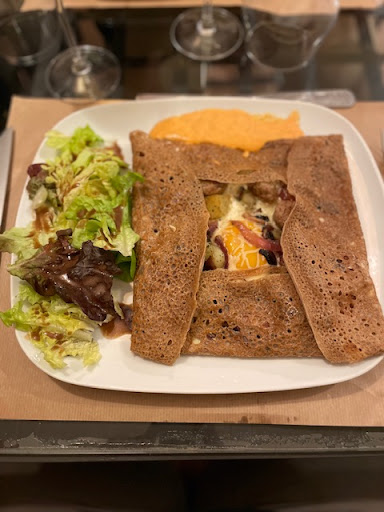 Récit: Je suis arrivé à 11h45 et j’ai pu profiter d’une des rares places de parking. Le restaurant et ses sanitaires sont accessibles en fauteuil roulant. Accueil aimable, tables métalliques avec plateau en verre, set de table imitant un tableau impressionniste et chaises en bois à assise paillée. Le cidre brut m’a paru bien léger par rapport à ce que j’ai pu consommer récemment en Normandie. La galette est garnie d’un œuf, de jambon fumé, d’une fondue de poireaux, de pomme de terre et d’emmental; C’est bon mais les pommes de terre manquaient « un poil » de cuisson. La gaufre servie chaude est excellente mais petite.