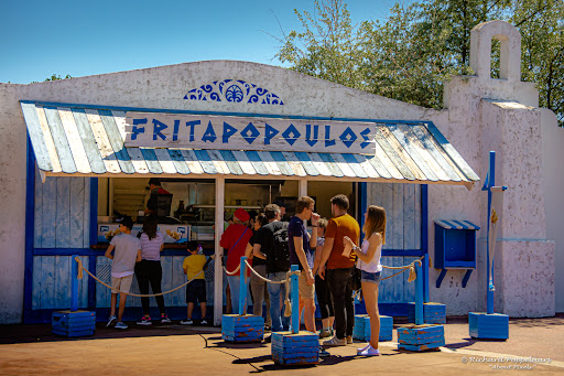 De naam van deze horecavestiging "Fritapopoulos" is bijzonder grappig en is door het park bedacht. De vestiging is op een realistische wijze vormgegeven in een Griekse bouwstijl en met de bekende witte en blauwe kleuren. Er zijn alleen geen bankjes met tafels om te zitten maar heel nabij is er genoeg plek om toch een zitplaats met tafel of een plekje langs de vijver te vinden.